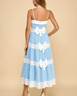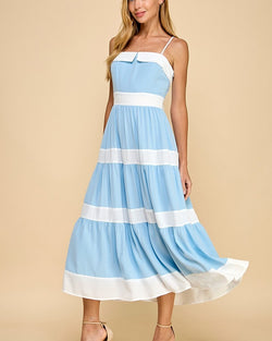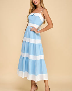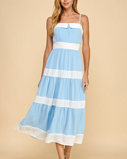 Get ready to twirl in this playful Tiered Midi dress with Alternating Contrast Stripes in Baby Blue! The tiers add movement and the contrast stripes add a fun twist. Perfect for any occasion, this dress will have you standing out from the crowd!