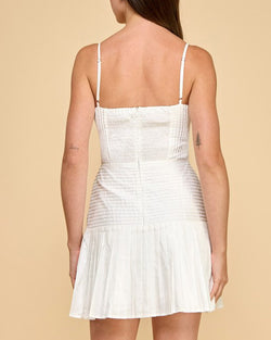 This flirty mini dress features an allover horizontal and diagonal pintuck pleat design on the bodice and a crisp pleated skirt. Finished with thin adjustable straps and a smocked back for a comfortable fit, this dress is a staple to wear all season.