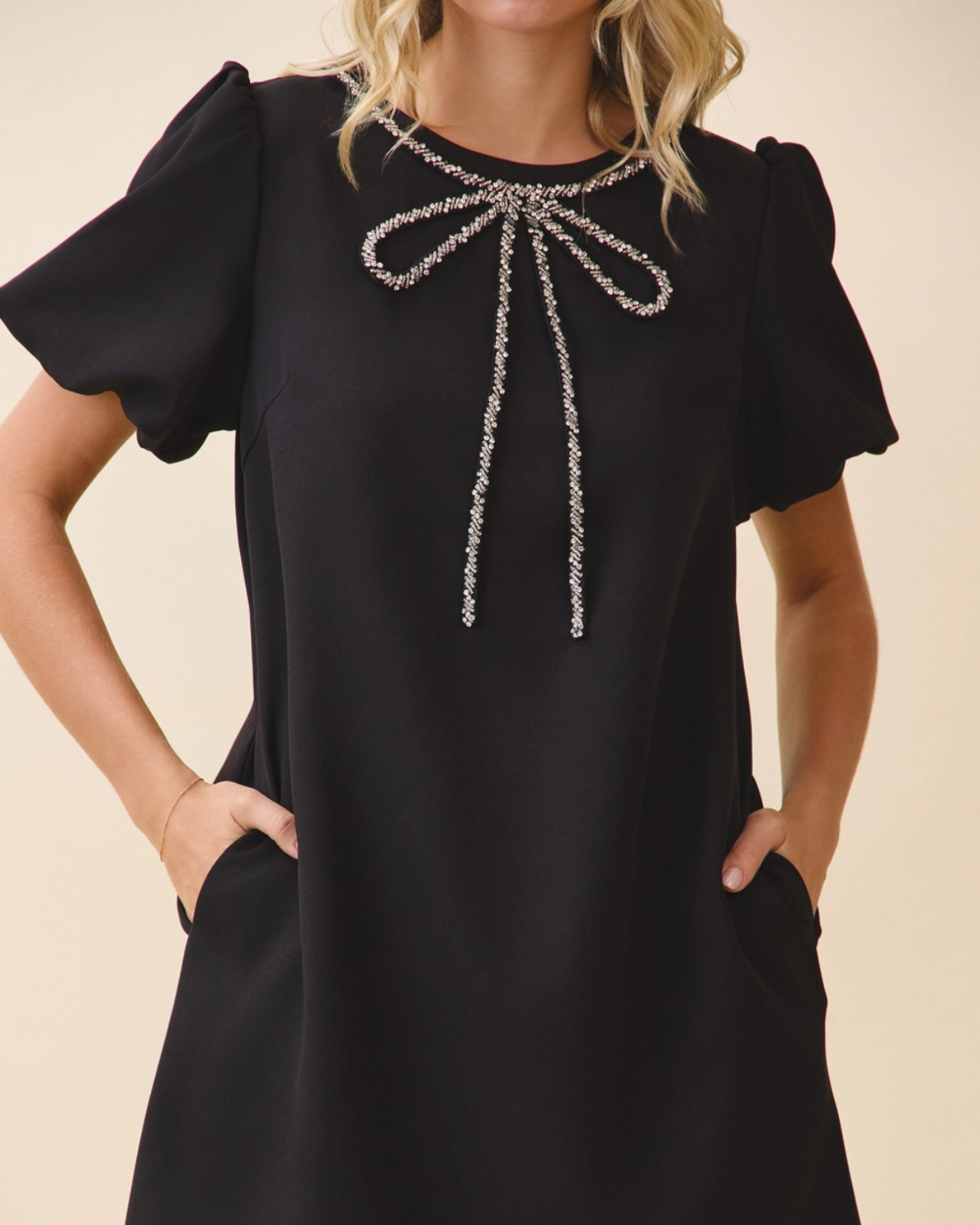 Playful and polished, this mini dress pairs charming puff sleeves with a round neckline crowned by a dazzling crystal bow. A fun twist on timeless style.