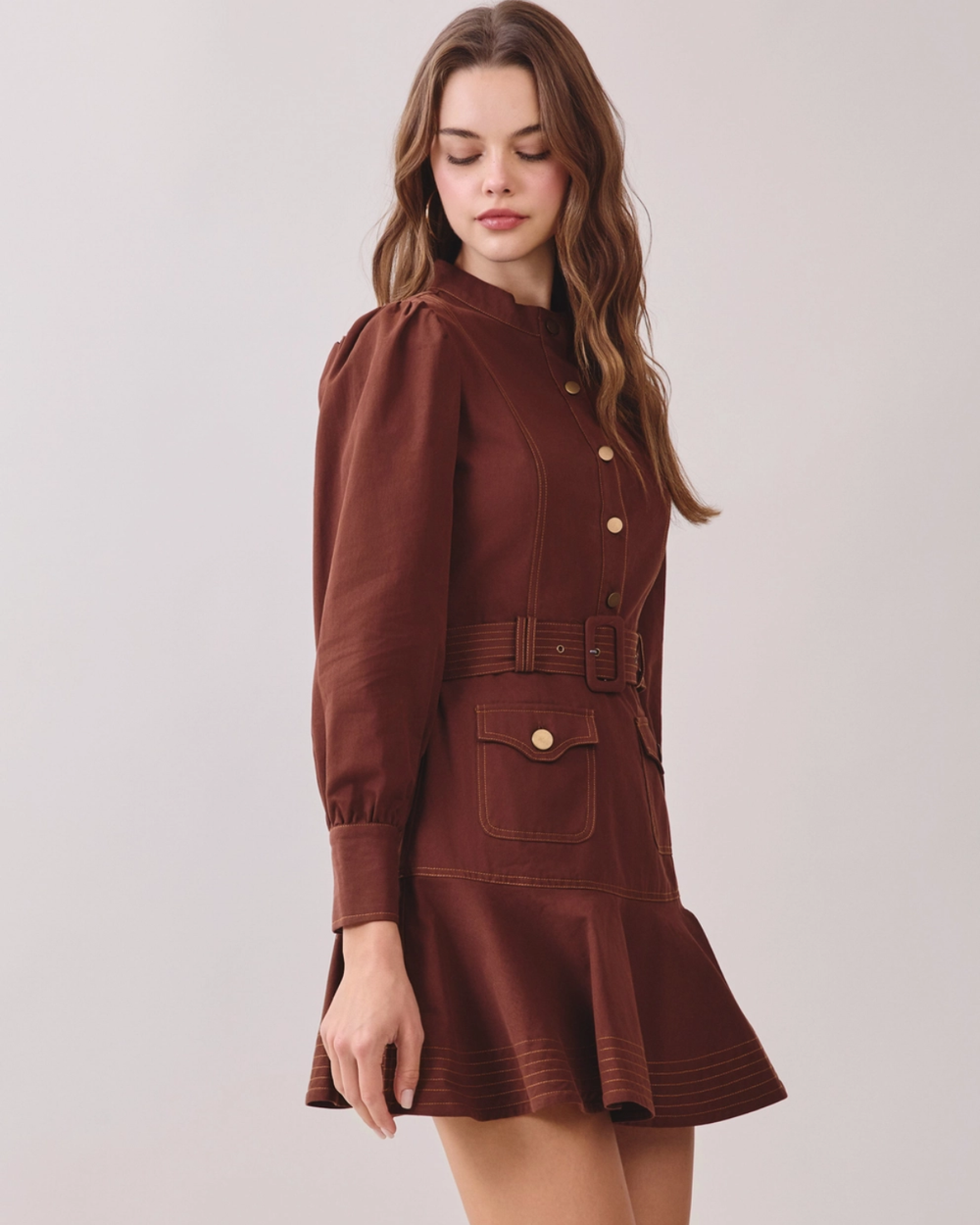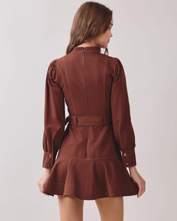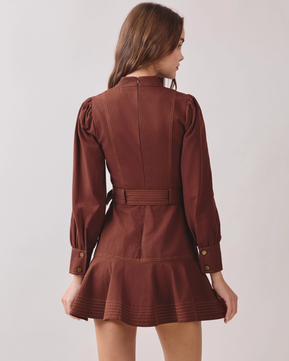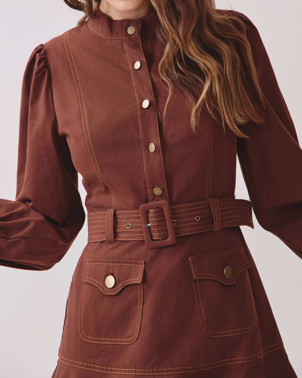 Chocolate mini dress with long puff sleeves, contrast topstitching, and a belted waist. Button-front placket and cuffed sleeves add playful detail to this mock neck essential.