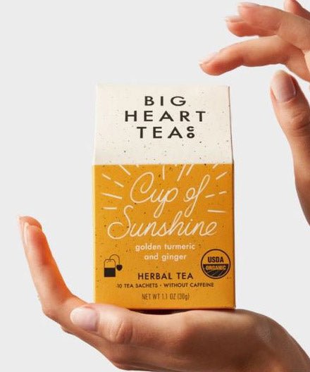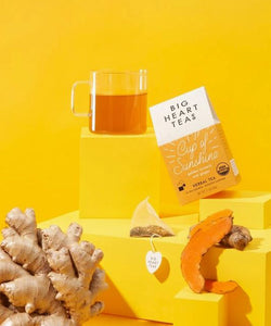 A signature turmeric tea. Turmeric, ginger, & Malabar peppercorn pack a triple punch of anti-inflammatory power. Not to mention, Cup of Sunshine is great for building your immune system and stimulating digestion. These are designed extra big to give the tea room to fully expand and breathe while it steeps.