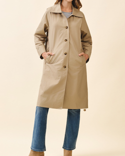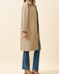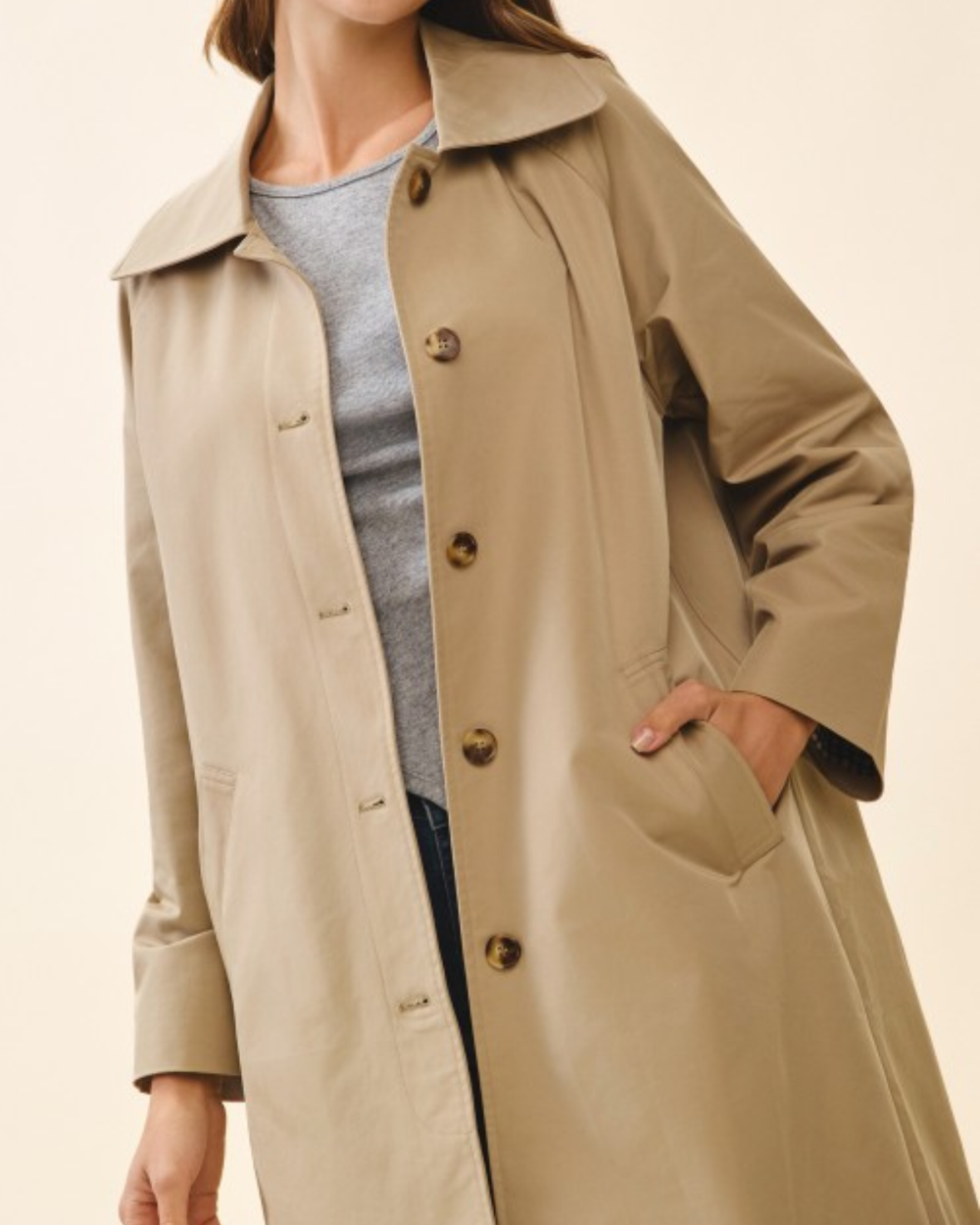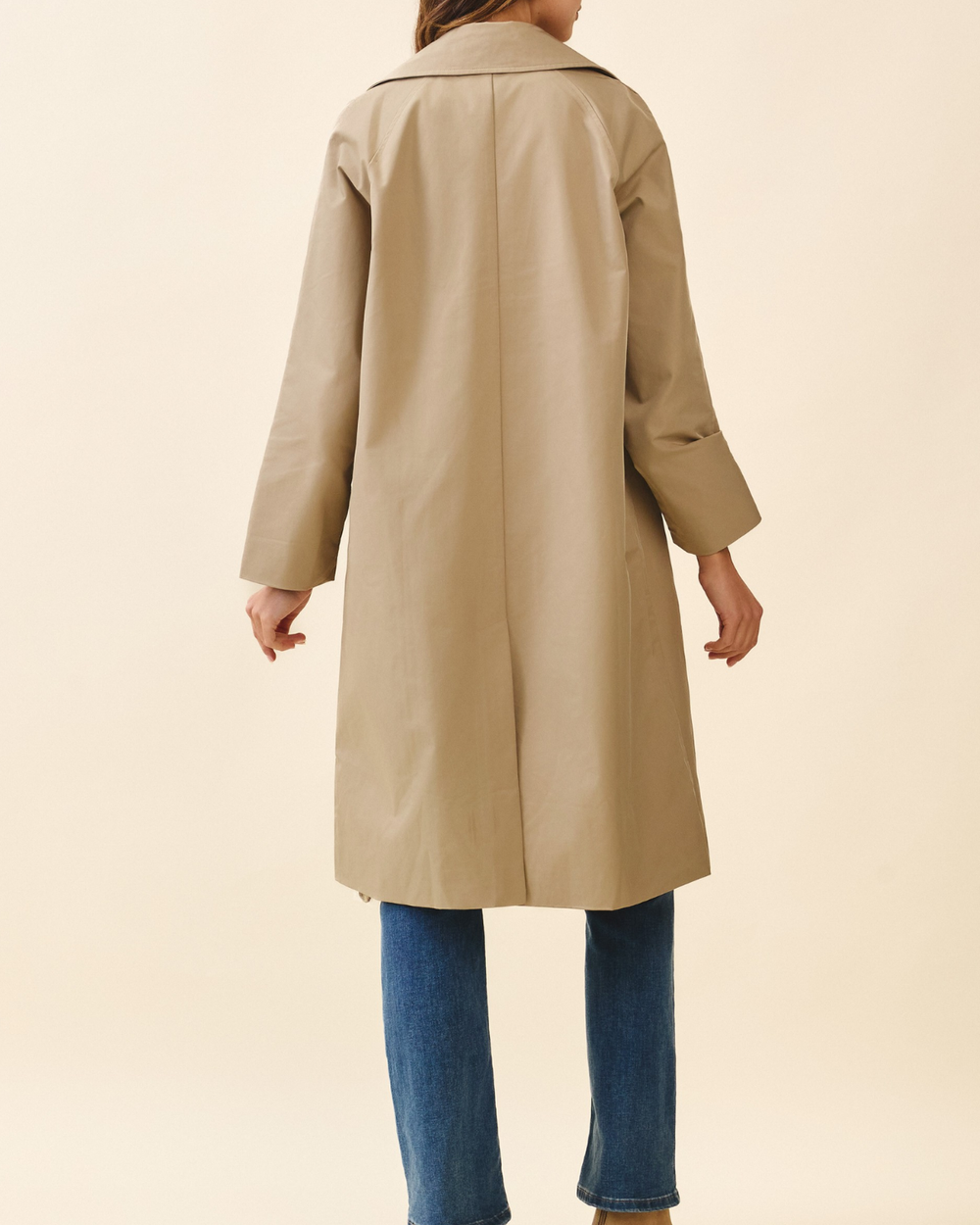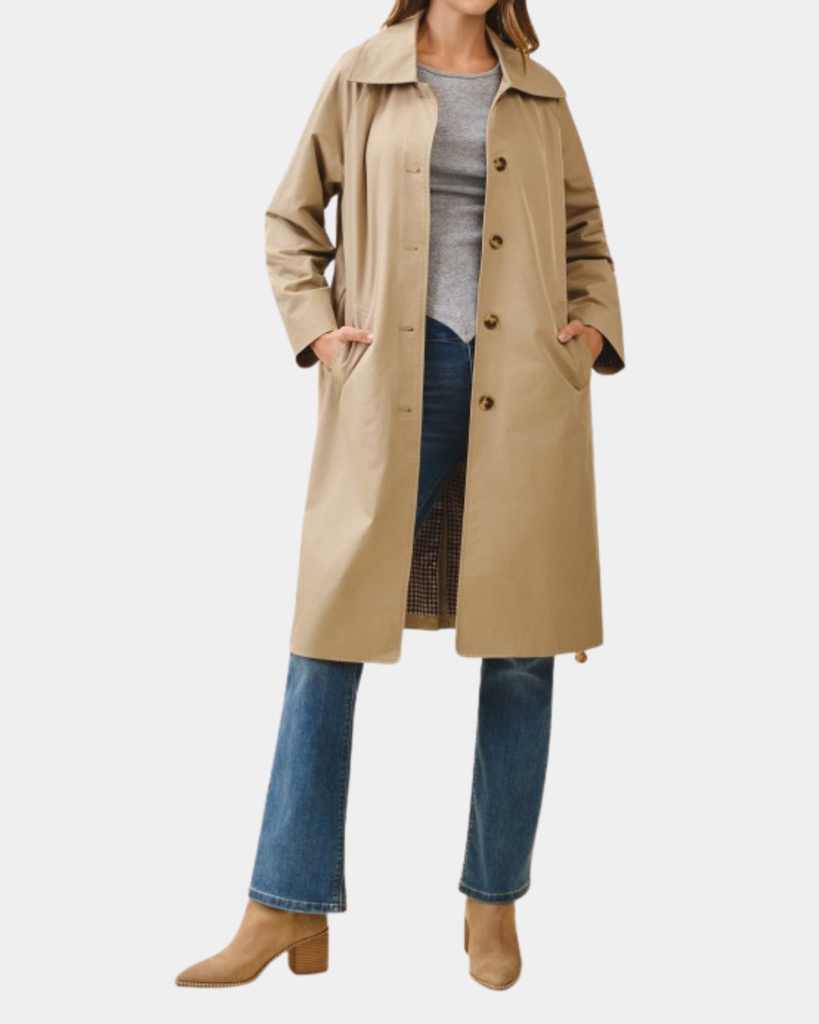 A longline trench-style coat featuring a spread collar, front button closures, and welt pockets. Designed in a relaxed straight silhouette with a clean, polished finish.