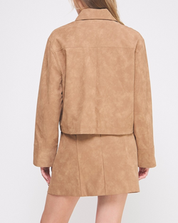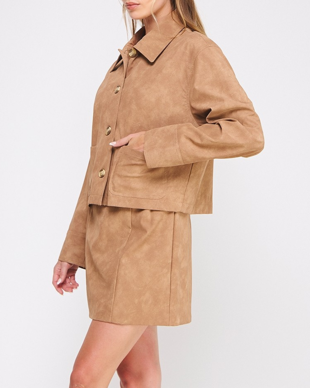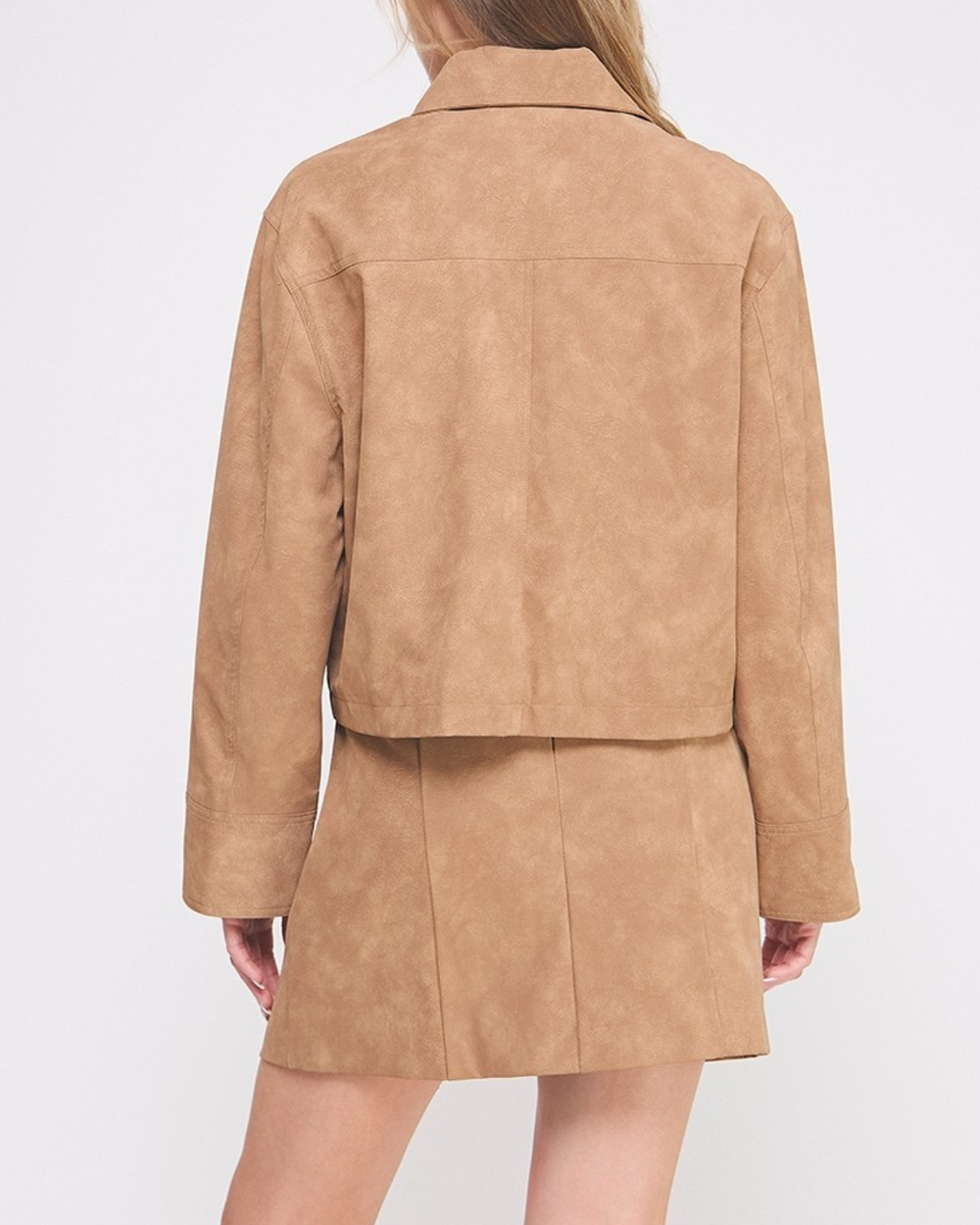 This camel suede jacket with a vegan leather collar adds a fun twist to your wardrobe essentials. Playfully chic and cruelty-free, it’s perfect for making a stylish statement.