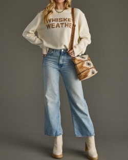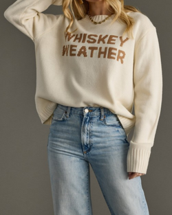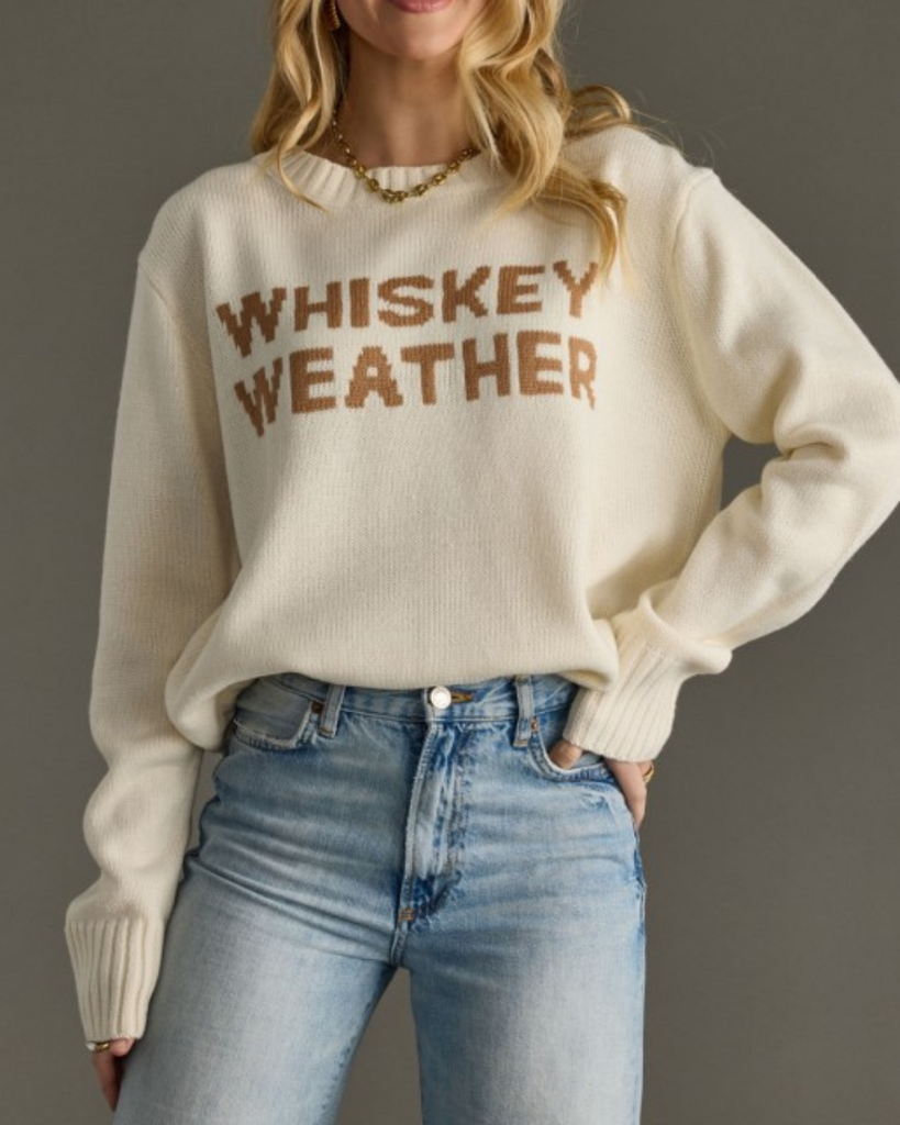 Cozy up in the Whiskey Weather Sweater in Ivory, featuring a fun brown "Whiskey Weather" text that’s perfect for those chilly days. It’s your new go-to for warmth with a playful twist.