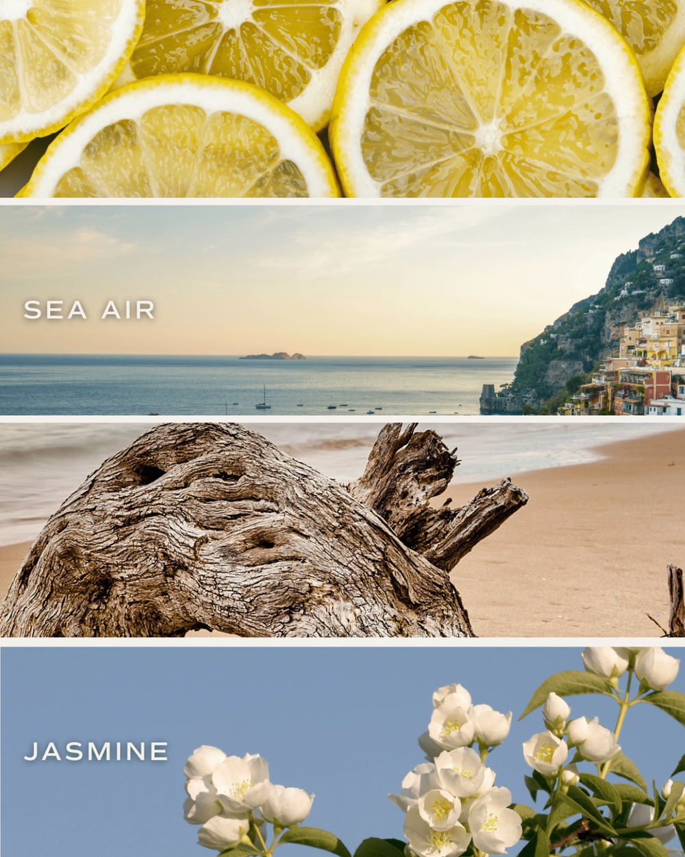 SCENT NOTES: Top: Sparkling Lemon Zest, Italian Bergamot, Sea Salt Mist / Middle: Fresh Lemon Leaf, Soft White Jasmine, Eucalyptus / Base: Driftwood, Sandalwood, Oceanic Accord