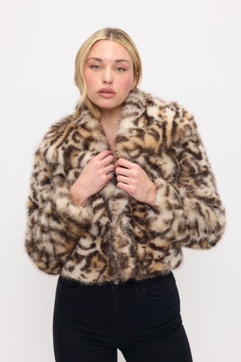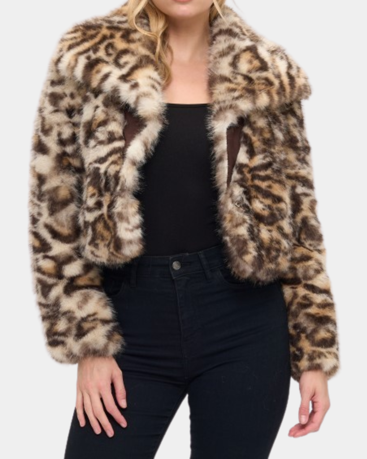 This leopard print faux fur coat combines warmth with refined elegance. The cropped cut and plush texture layer beautifully over dresses, denim, or tailored pieces, delivering a luxe finish with effortless sophistication.