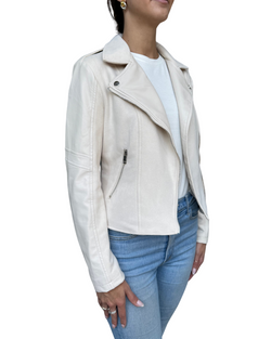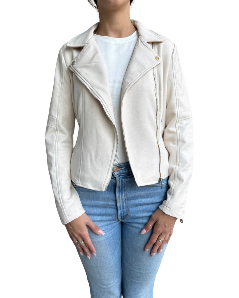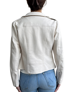 This cropped vegan leather blazer in cream offers a refined silhouette with a contemporary edge, perfect for elevating any outfit.