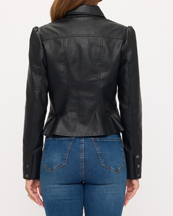 The Princess Sleeve Button Moto Jacket presents a refined reinterpretation of the traditional moto aesthetic. Constructed from sleek faux leather, it balances strong biker features with a graceful, feminine silhouette.