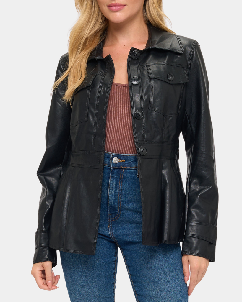 A refined faux leather jacket with a classic shirt-inspired cut that balances structure and ease. Style it loose for relaxed comfort or cinched for definition.