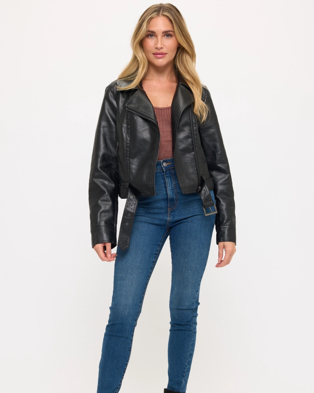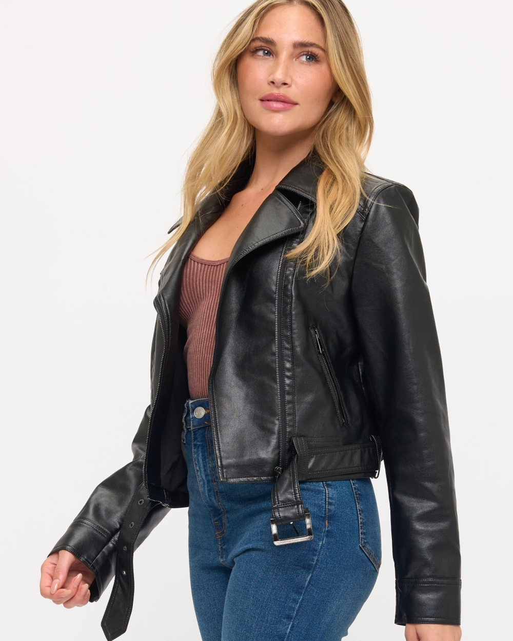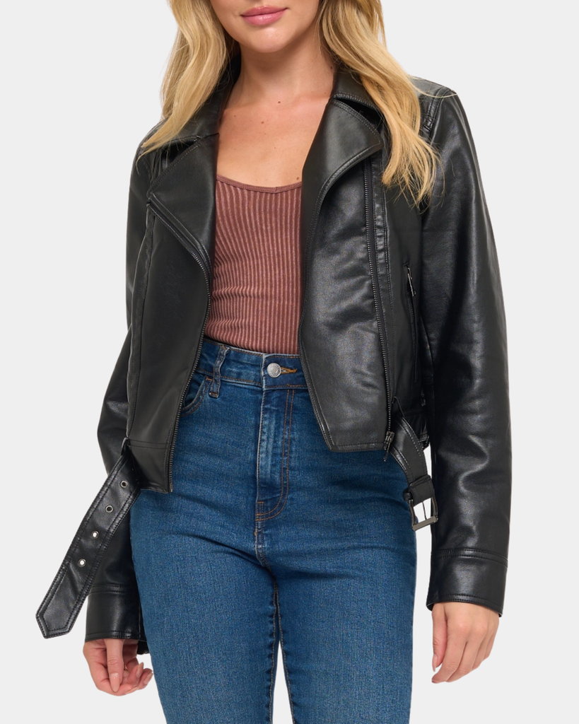 Fearless style meets city streets. This black moto jacket features supple faux leather that gains character with wear, strategic belt detailing for a sharp silhouette, and classic biker edge. Your new go-to for urban adventures.