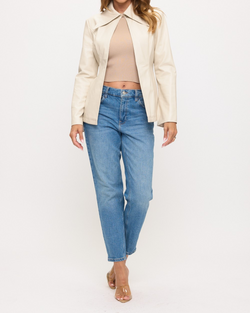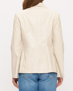 The Bohemian Baroness vegan leather blazer showcases expert craftsmanship with a unique zip-front and oversized pointed collar, blending vintage allure with modern elegance. Crafted from premium faux leather, it offers a rich texture and ethical appeal, while the fitted silhouette and extended length flatter feminine curves gracefully.