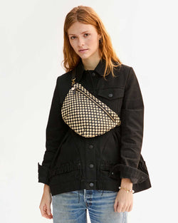 Go hands-free in style with Clare V.'s Woven Checker Grande Fanny. Chic black and cream design adds a unique touch to any outfit. Perfect for traveling or daily use. Say goodbye to bulky bags and hello to effortless convenience!