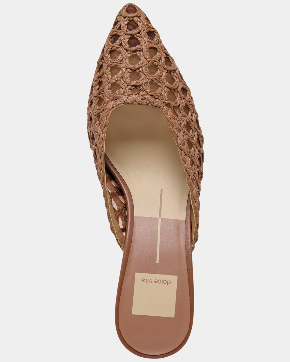Effortless sophistication meets warm-weather style with the Cleo Loop Heels. Featuring a refined pointed toe, low architectural heel, and natural raffia accents, this mid-brown mule pairs beautifully with everything from tailored separates to vacation dresses. Responsibly crafted for the conscious, discerning wearer.