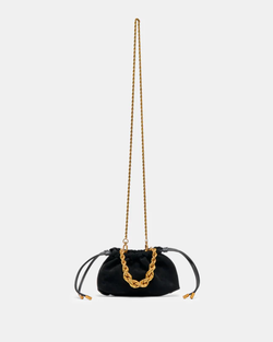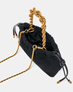 Cleo’s refined design features rich suede tones and a bold gold chain, combined with a drawstring closure and a hands-free crossbody strap. This bag effortlessly balances sophistication and practicality for any occasion.