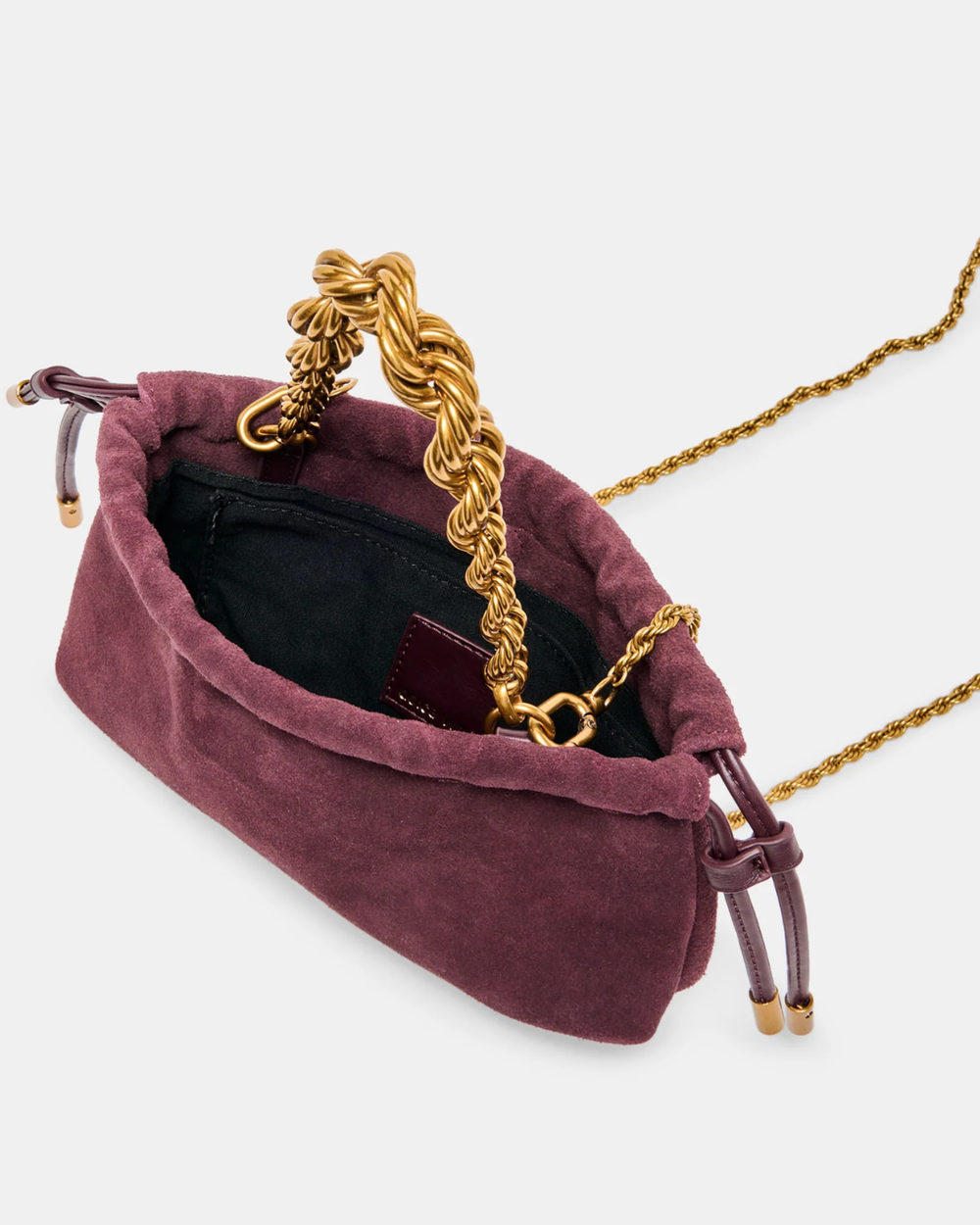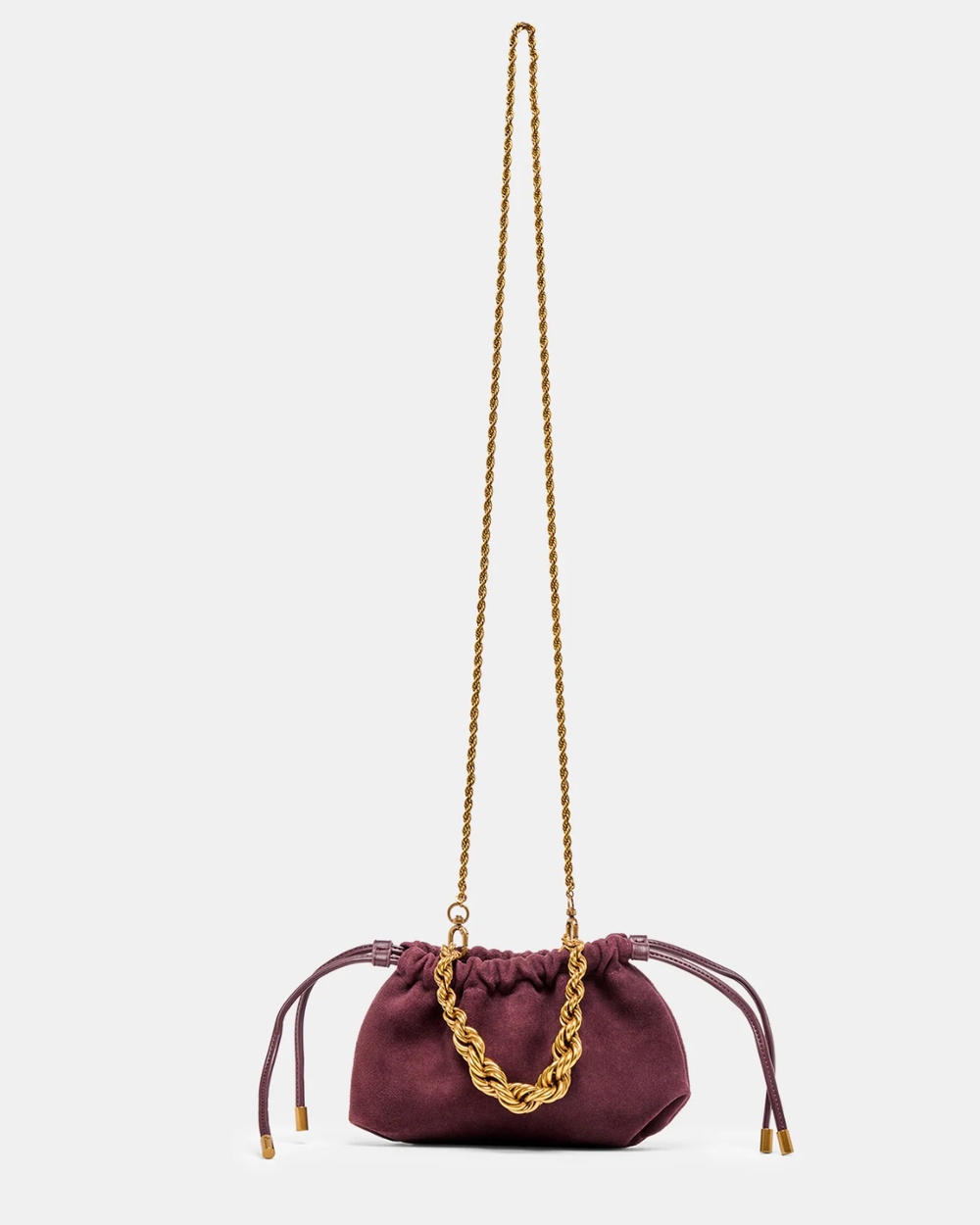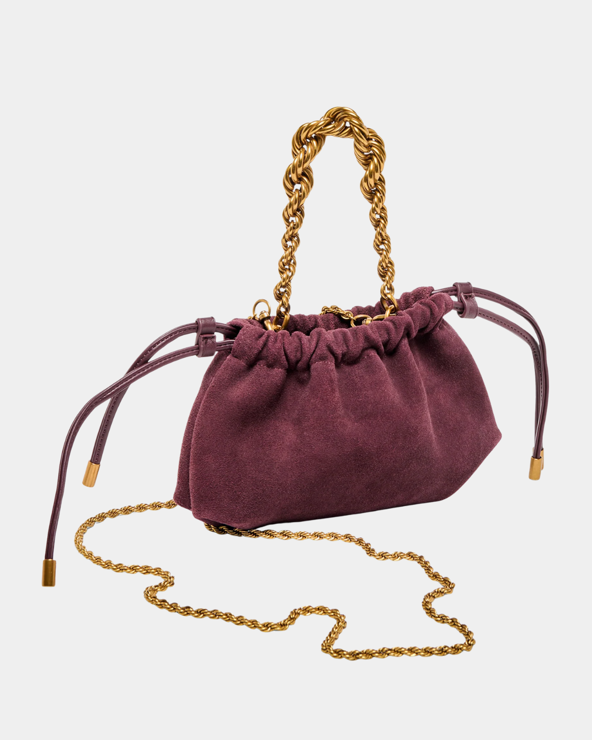 Cleo’s refined design features rich suede tones and a bold gold chain, combined with a drawstring closure and a hands-free crossbody strap. This bag effortlessly balances sophistication and practicality for any occasion.