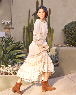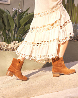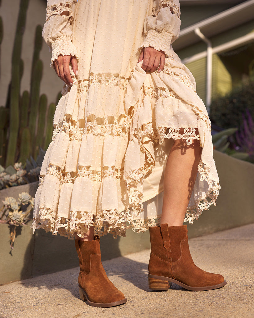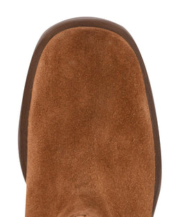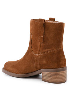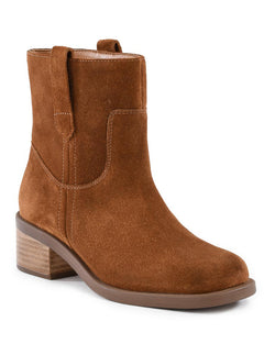 These classic ankle booties are made from rich brown suede and feature a pull on silhouette with a stacked heel. The perfect everyday shoe for fall and beyond.