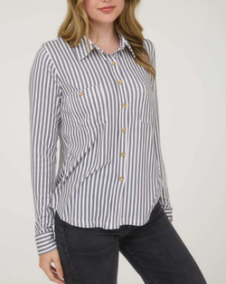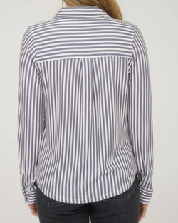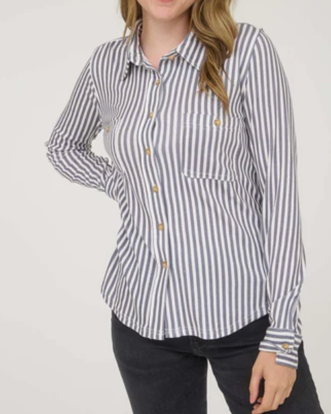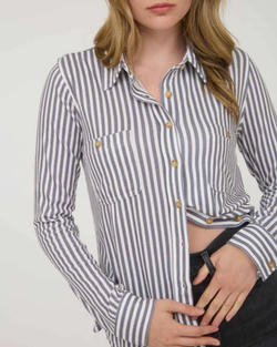 This classic button-down shirt combines refined design with comfort. Crafted in soft knitwear, it features long sleeves and practical pockets, enhanced by a subtle stripe pattern for a polished look. Ideal for elevating your everyday wardrobe with understated elegance.