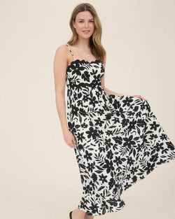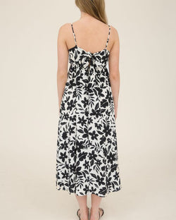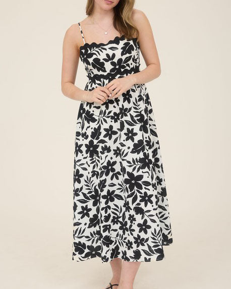 This pretty floral print midi dress is done in black and white color scheme and features an empire waist, a back cut-out and wavy trim detail. A summer staple to dress up or down!