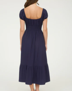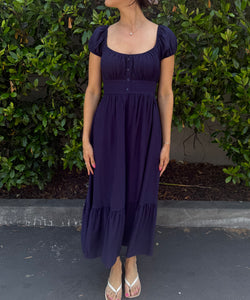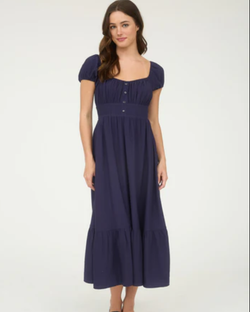 Step into effortless charm with the Button Front Cap Sleeve Midi Dress in Navy. This playful dress features delicate cap sleeves and a flattering midi length, perfect for twirling through sunny days or casual evenings. The button-front detail adds a touch of vintage flair, making it easy to dress up or down!