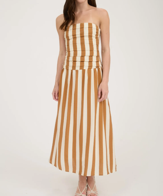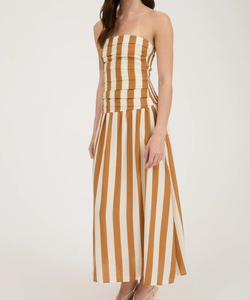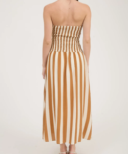 This standout stripe dress features a strapless top, back smocking and a vertical stripe pattern. The fitted body with a drop waist complete the look. Easy to dress up or down. So chic!