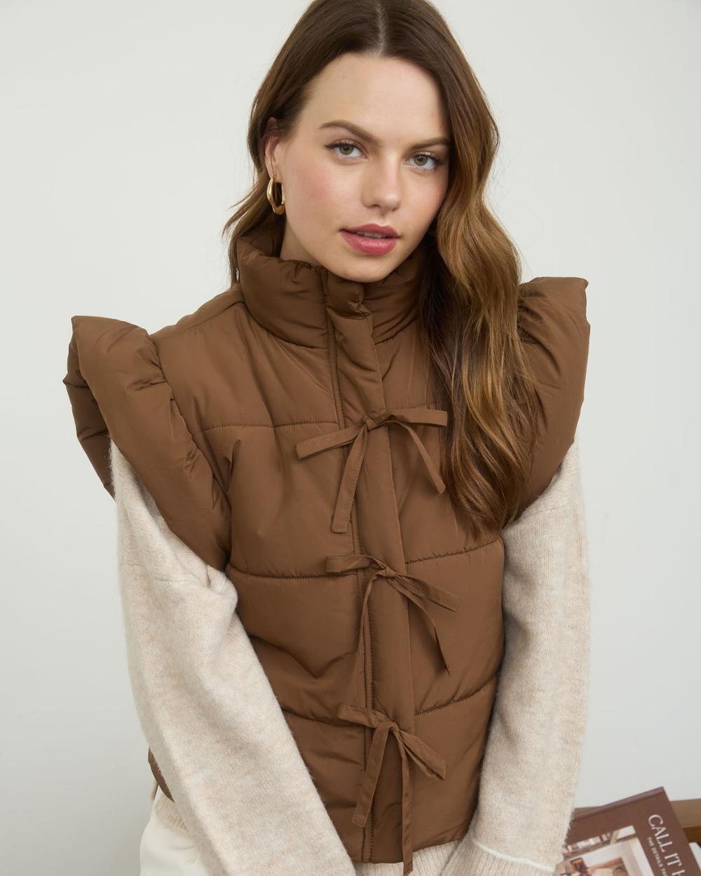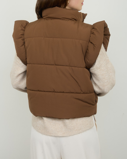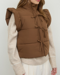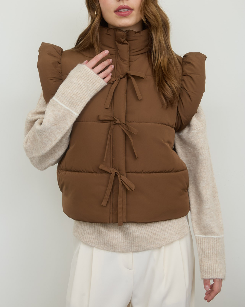 Stay cozy and cute with this Flutter Sleeve Bow Puffer Vest in warm brown, perfect for adding a fun twist to chilly days. The playful bow detail and flutter sleeves bring charm while keeping you snug and stylish!