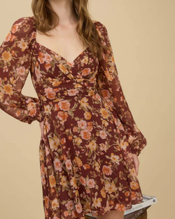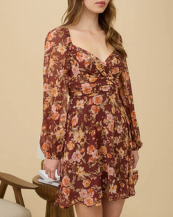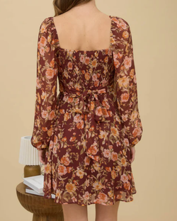 This gorgeous mini dress features a chic sweetheart neckline and long sleeves for an elegant look. The back smocking and wrap waist detail provide a flattering, tailored fit, while the back tie adds a delicate finishing touch. Fully lined with a charming floral pattern, this mini dress combines comfort and style for refined occasions.