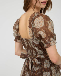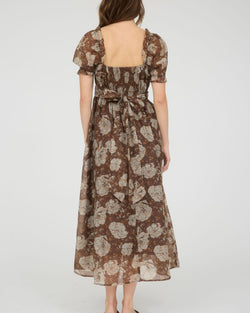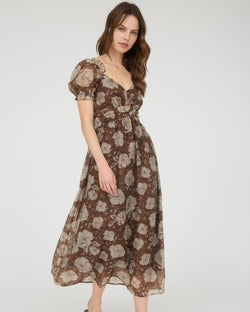 This gorgeous floral midi dress features a sweetheart neckline, short puff sleeves and a back waist tie. Easy to dress up or down and done in a pretty color combination, this dress is easy to wear, day or night.