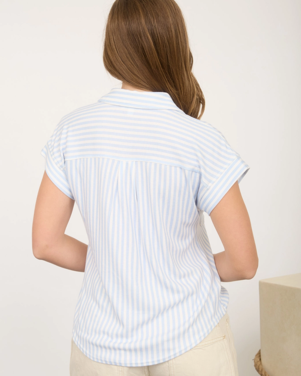 The staple top every girl needs in her wardrobe.  This top features an all over vertical stripe and two front pockets. Pair this with your favorite jeans for an effortless yet chic outfit.