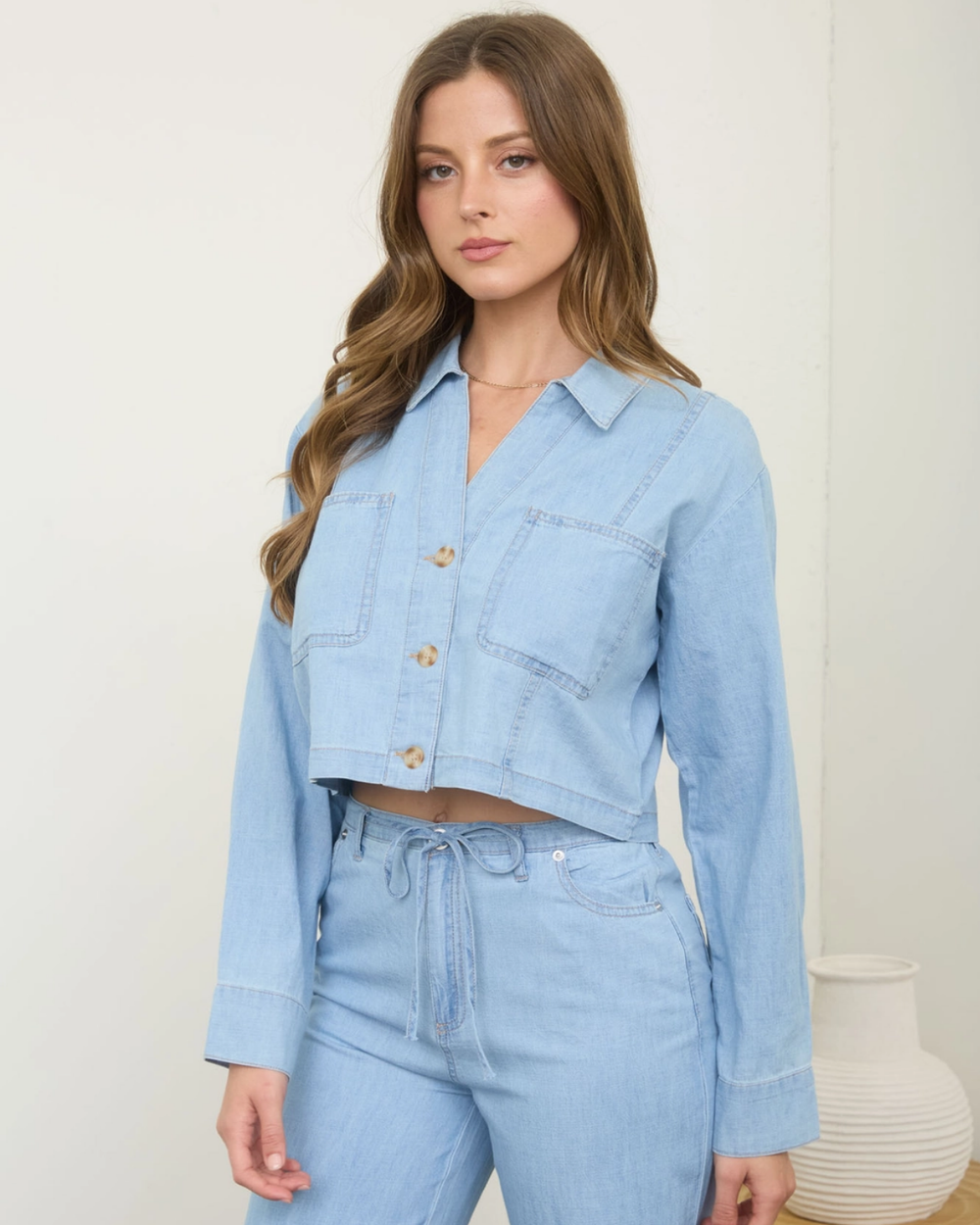 Crisp denim meets timeless style with this button-down collared top. Perfect for layering or wearing solo, it's your go-to piece for effortless cool. Dress it up or down—this versatile classic works with everything in your closet.