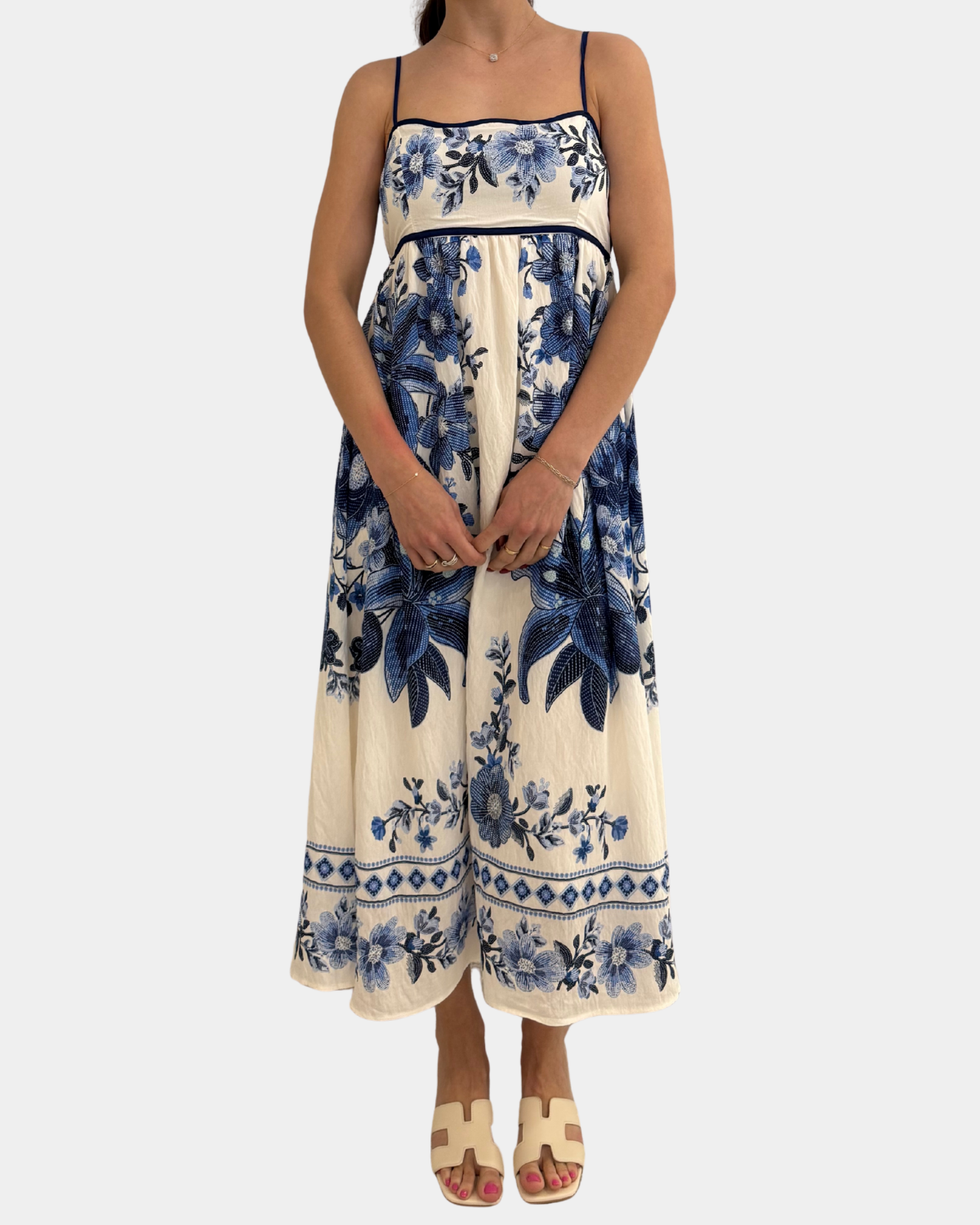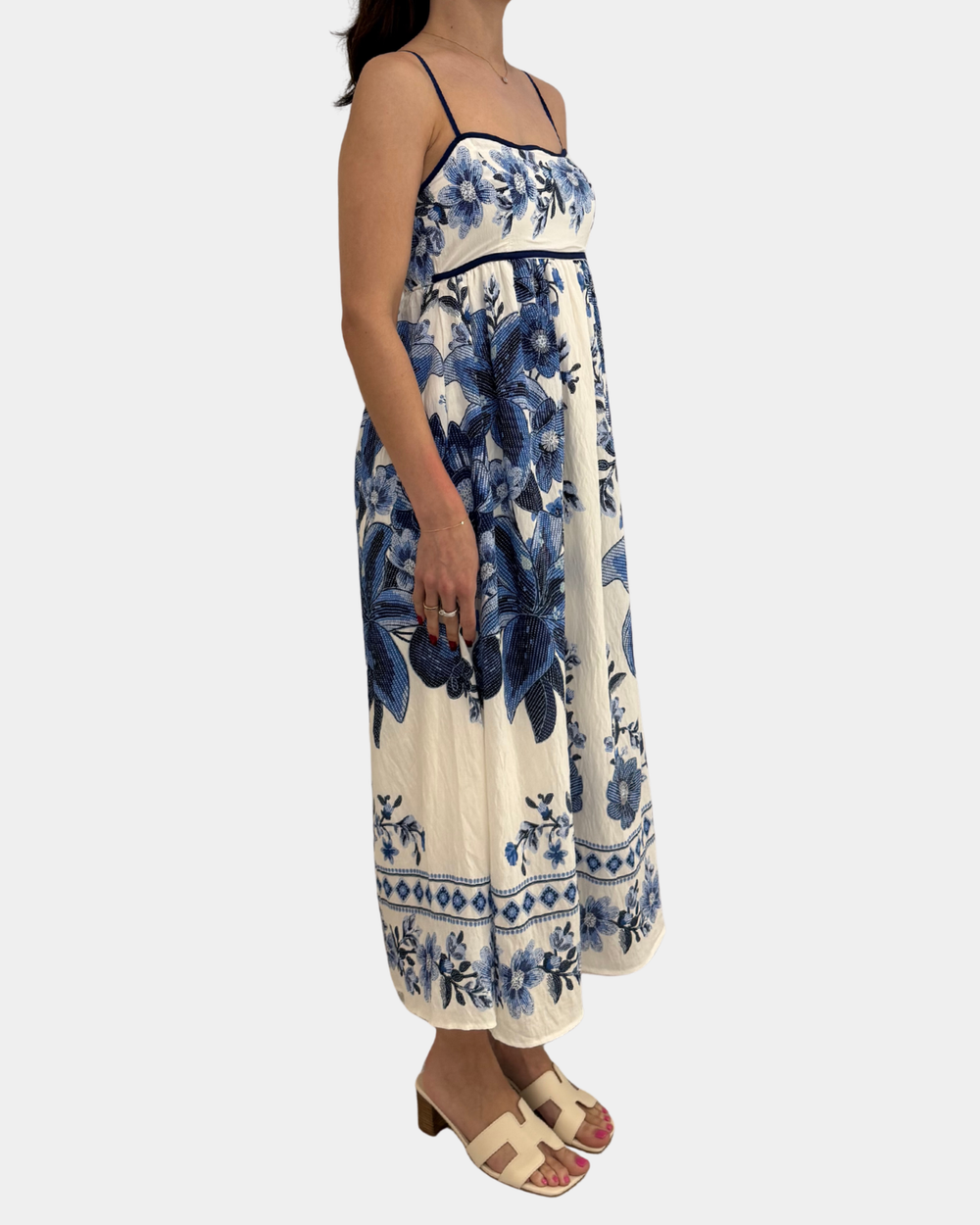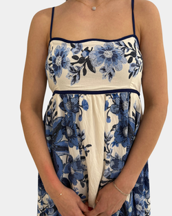 Twirl into spring in this charming blue floral dress! Delicate blooms dance across soft fabric, while crisp solid piping trim adds a polished pop of contrast. Perfect for garden parties, weekend brunch, or whenever you want to feel effortlessly put-together.