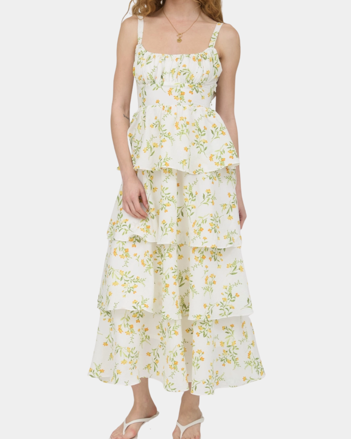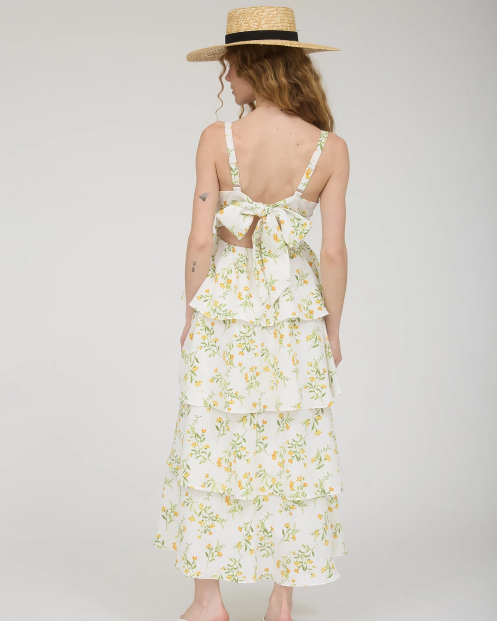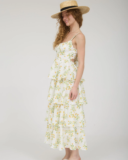 Featuring delicate tiered ruffles down the back and a sweet tie detail, it's the perfect blend of feminine and fun. The vibrant yellow and multi-color floral print brings instant joy to any occasion.