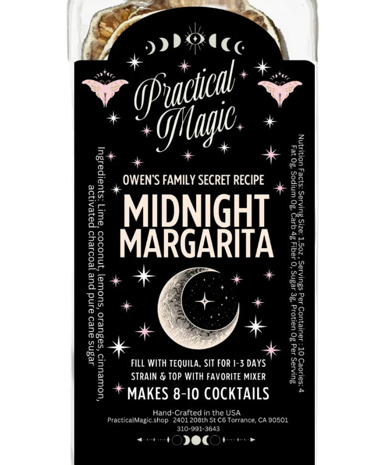 Inspired by our favorite movie Practical Magic, the Midnight Margarita is extra special because it’s not only delicious but it’s a beautiful black color as well. The Owen Sister’s Secret Recipe is made with a blend of lemon Verbena, Barbados Lime, Coconut, Cinnamon, Lemons, Limes, Raw Vegan Sugar and Activated Charcoal.