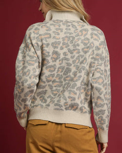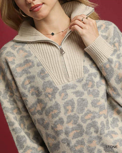 This soft leopard print sweater features a quarter zip closure, a pullover style and a ribbed stand collar. The perfect fall sweater to wear all season.