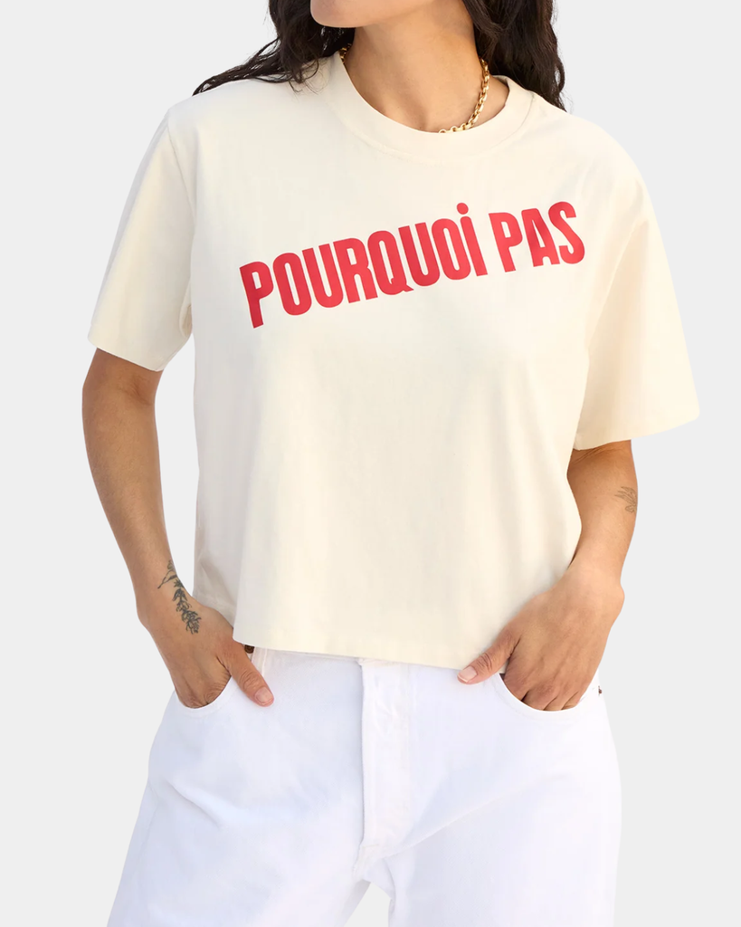 Why not embrace the moment? This charming Clare V. tee whispers "pourquoi pas"—a gentle nudge to dress cute, step out, and savor life.