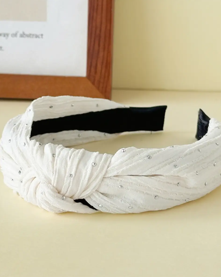 Elevate your look with this sophisticated top knot headband, featuring a classic white base adorned with delicate pearl polka dots. A timeless wardrobe staple, it effortlessly complements both casual and polished ensembles while adding a touch of refined elegance. Comfortable and chic, this headband is perfect for enhancing your style with understated luxury.