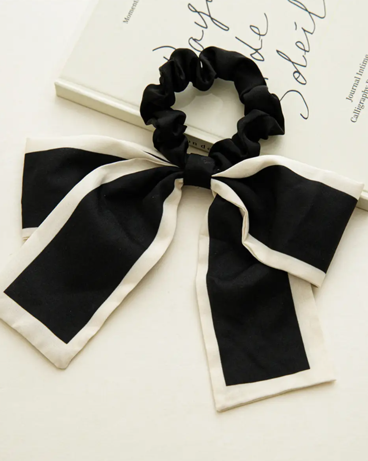 Elevate your look with this refined ribbon bow hair tie in black with a white trim. Combining functionality with a polished, preppy style, it secures your ponytail while adding a chic, elegant touch to your ensemble. Perfect for effortlessly sophisticated hairstyles that stand out with subtle grace.