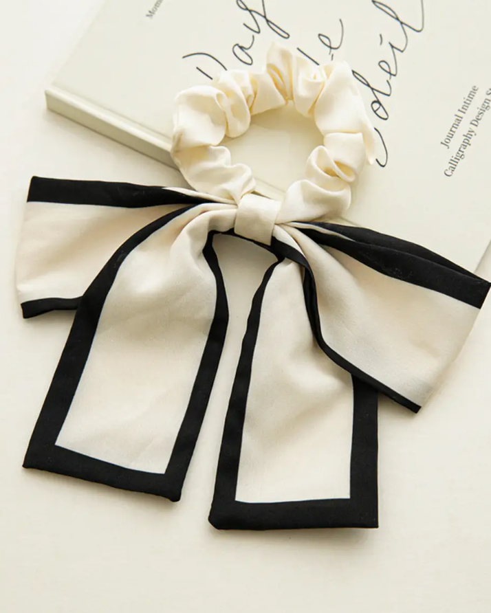 Elevate your look with this refined ribbon bow hair tie in white with a black trim. Combining functionality with a polished, preppy style, it secures your ponytail while adding a chic, elegant touch to your ensemble. Perfect for effortlessly sophisticated hairstyles that stand out with subtle grace.