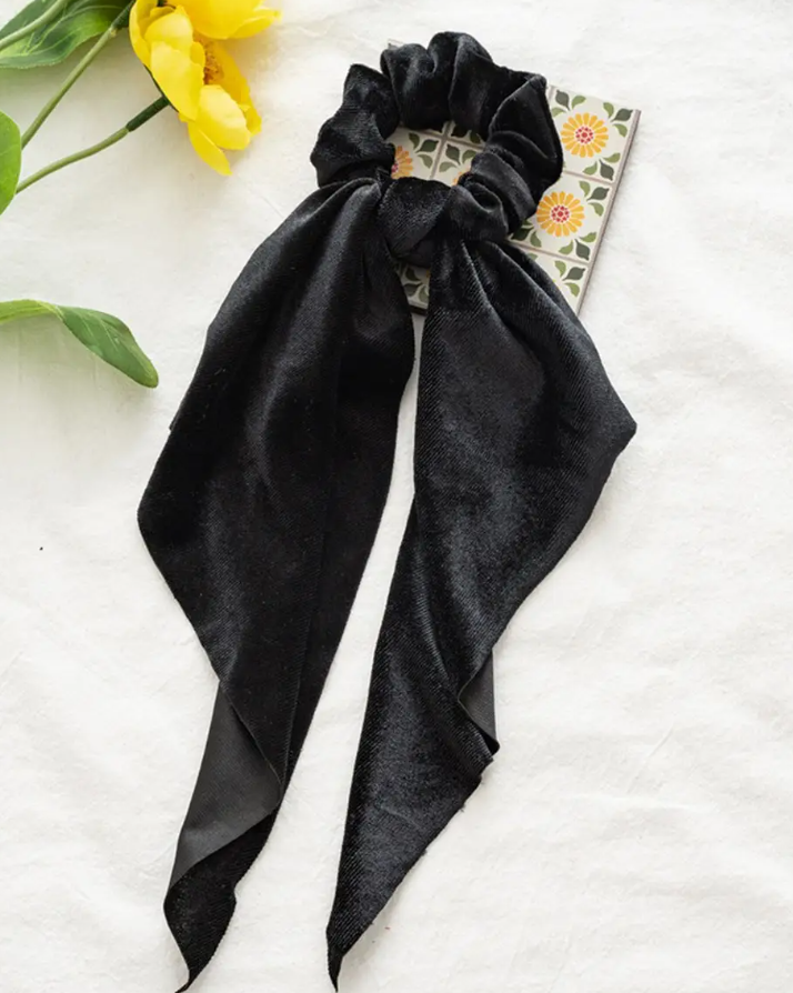 A hair tie with a scarf ending that brings an on trend and chic vibe to your look.