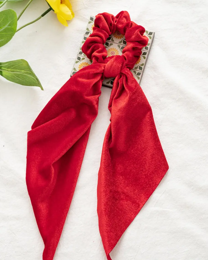 A hair tie with a scarf ending that brings an on trend and chic vibe to your look.