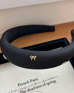 Elevate your look with this black headband featuring a striking gold bow detail. Its wide brim design offers a chic and refined touch, perfect for adding elegance to any hairstyle. A sophisticated accessory that effortlessly combines style and versatility.