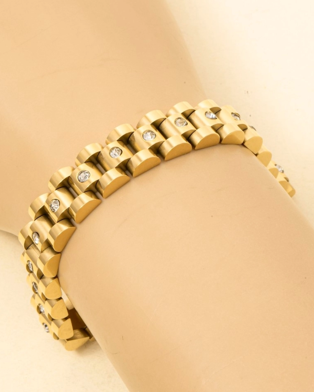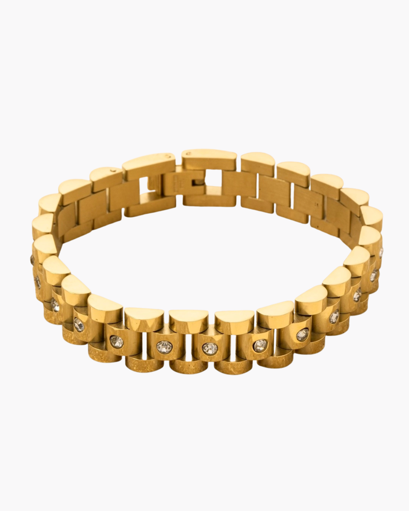A polished gold chain bracelet with studded stainless steel accents. Its refined aesthetic pairs effortlessly with any wardrobe, delivering understated luxury and versatile style.