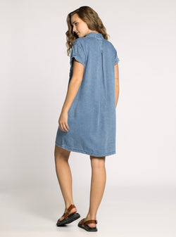 The June Dress in Dusty Denim is your ticket to effortless style. Featuring a crisp collar, short sleeves, and a versatile midi/mini cut, this denim staple transitions seamlessly from day to night.