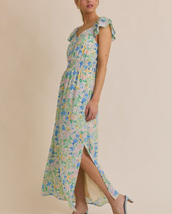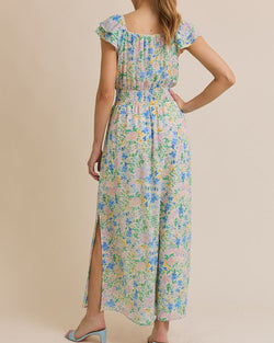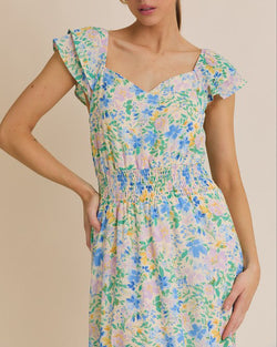 This pretty floral print dress features a sweetheart neckline, short flutter sleeves and a smocked waist. Comfortable and lightweight, this dress can be worn day or night. The perfect summer addition to your summer wardrobe.