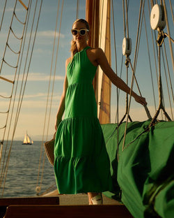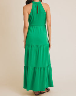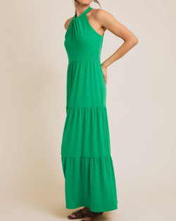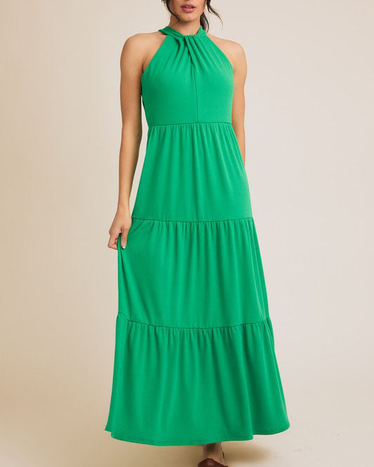 This gorgeous dress dress features a chic halter neckline with a front twist, a sleeveless silhouette and a soft, ribbed fabrication. Easy to dress up or down, this dress is a must for summer days or nights.