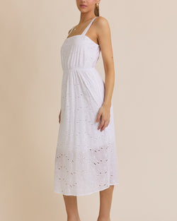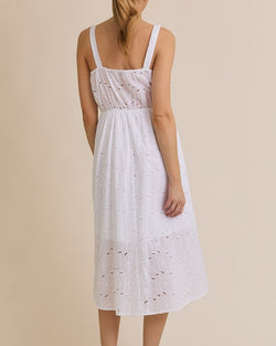 Be the epitome of summer chic with our Eyelet Sleeveless Dress in white. Made with delicate eyelet fabric, this dress is perfect for warm days and nights. Take a twirl in this playful and effortlessly stylish dress!
