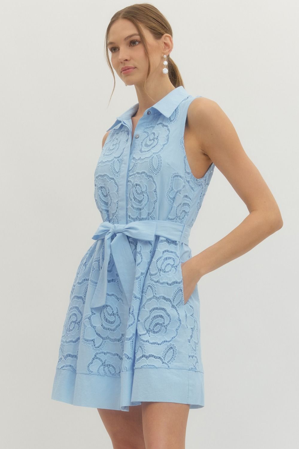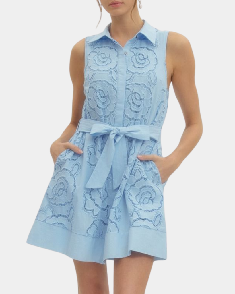 This sleeveless mini dress pairs a solid base with a delicate floral lace overlay for effortless charm. Perfect for warm-weather outings, casual dates, or whenever you want to feel put-together without trying too hard.