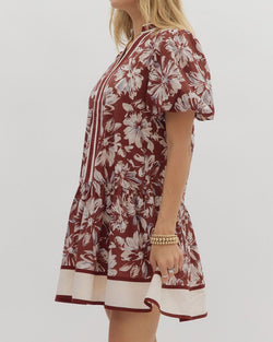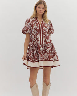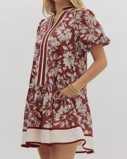 This floral print mini dress features short bubble sleeves, a ruffle hem and multicolor contrast accent neck band and hem finish. Easy to dress up or down, this dress can be styled with everything from sneakers to boots to heels.