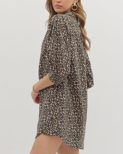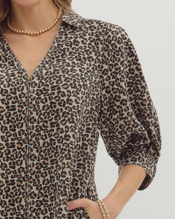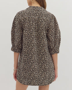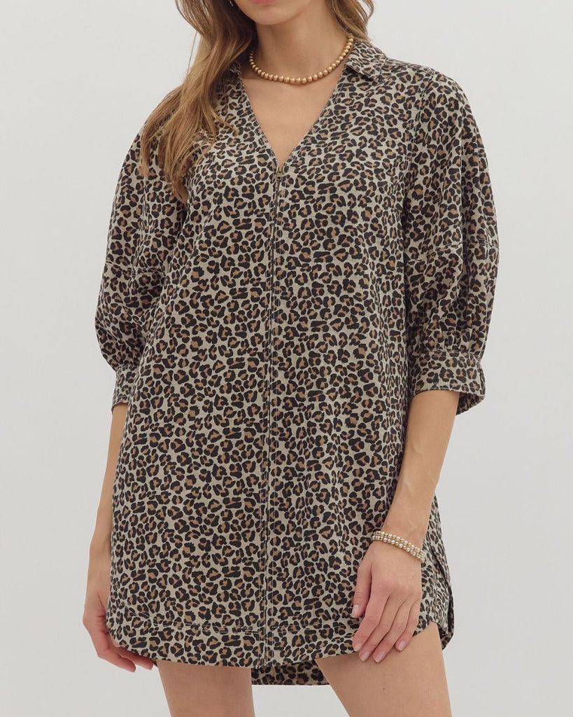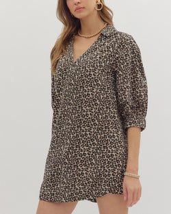 This leopard print mini dress features a v-neckline, three quarter puff sleeves and pockets at the sides. Comfy and chic, this dress can be styled with everything from sneakers to boots to sandals.