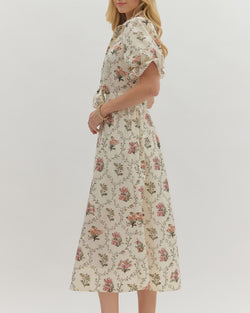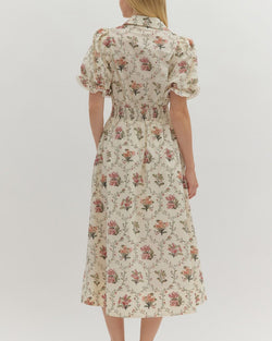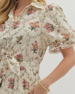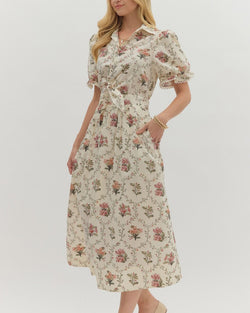 This pretty botanical print midi dress features short puff sleeves, a collared neckline, partial front buttons, a waist tie and scallop trim cuffs. Easy to dress up or down, this dress is a must for an elevated look.