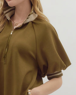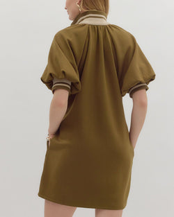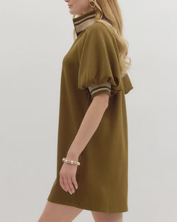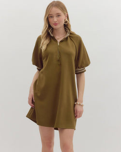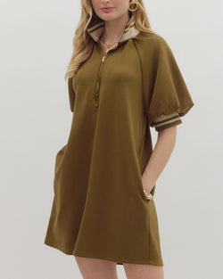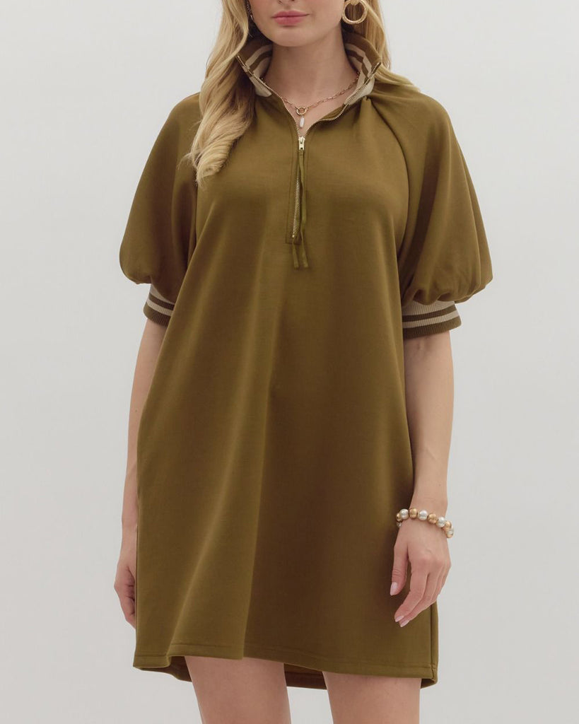 This olive half-zip mini dress combines minimalist design with functional details. The front zipper offers adjustable styling options, while the multicolor ribbed trim adds subtle contrast. Practical side pockets enhance convenience without compromising the streamlined silhouette, making it an expert choice for contemporary wardrobes.